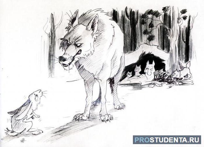 Наступило утро, волк вышел с норы, потянулся и довольно замахал хвостом. Он подошёл к пленнику, сгрёб его в охапку и собрался запустить когти в его живот. Волчата стояли рядом и обучались мастерству отца. Закричал заяц, что есть мочи и кубарем скатился с горы.