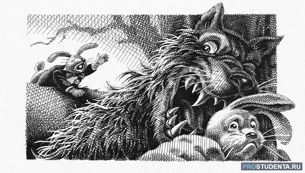 В сказке Салтыкова-Щедрина рассказывается про зайца, который торопился на собственную свадьбу и попал в волчьи лапы. Косой стал пленником серого и рисковал быть съеденным, но у него оставалась надежда на помилование. Поведение зайцев с волками в кратком содержании «Самоотверженный заяц» схоже с отношениями простого народа и власть имущих.