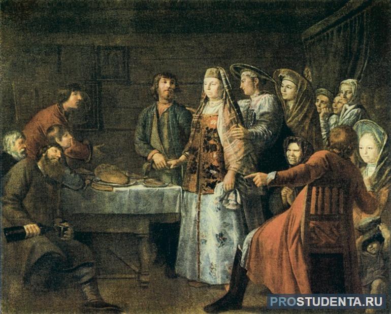 Крепостной художник Михаил Шибанов родился и вырос в деревне Мясоедово Суздальской губернии. Он хорошо знал обычаи русских крестьян. Один из них он изобразил на полотне «Празднество свадебного договора».