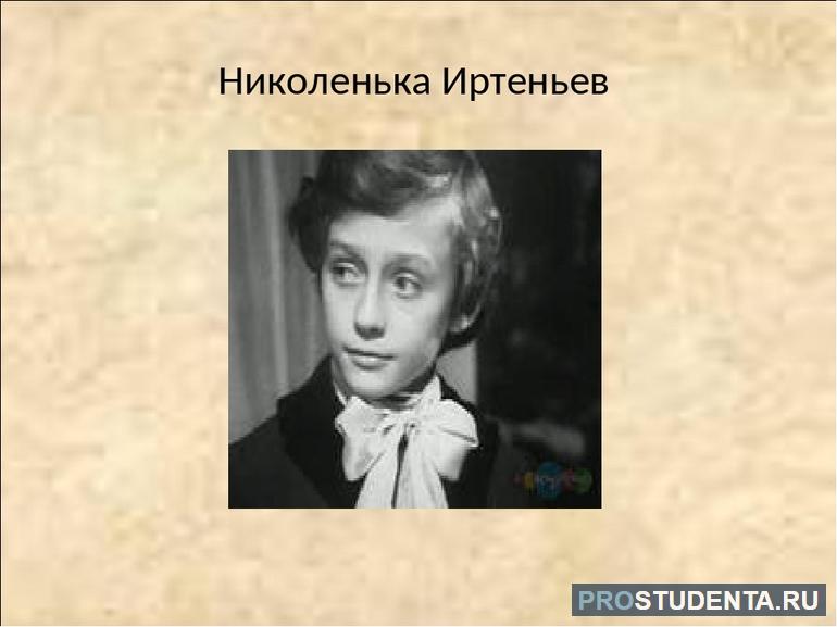 - Иртеньев Николай (Николенька) — главный герой. Ранимый юноша с чувственной душой. От его лица ведется повествования. На момент происходящих событий мальчику всего четырнадцать лет.